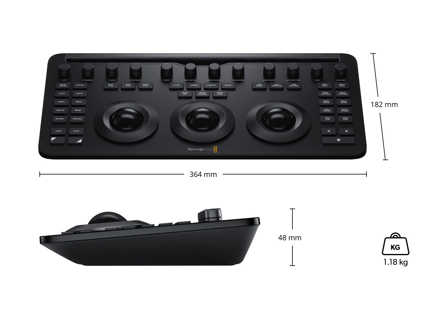 Nowy DaVinci Resolve Micro Color Panel wyposażony jest w 3 wyważone trackballe o wysokiej rozdzielczości i 12 precyzyjnie obrobionych maszynowo pokręteł sterujących, które zapewniają bezpośredni dostęp do najbardziej zaawansowanych funkcji podstawowej korekcji kolorów, ułatwiając eksperymentowanie i wypróbowywanie nowych kombinacji. Główne pokrętła mogą być używane do sterowania opcjami Y Lift, Y Gamma, Y Gain, Kontrast, Obrót, Średnie wyostrzenie, Wzmocnienie koloru, Cienie, Podświetlenia, Nasycenie, Odcień i Miks luminancji.